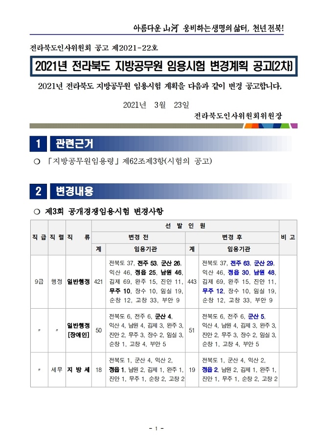 ▶ 2021년 전라북도 지방공무원 임용시험 변경계획 공고(2차)