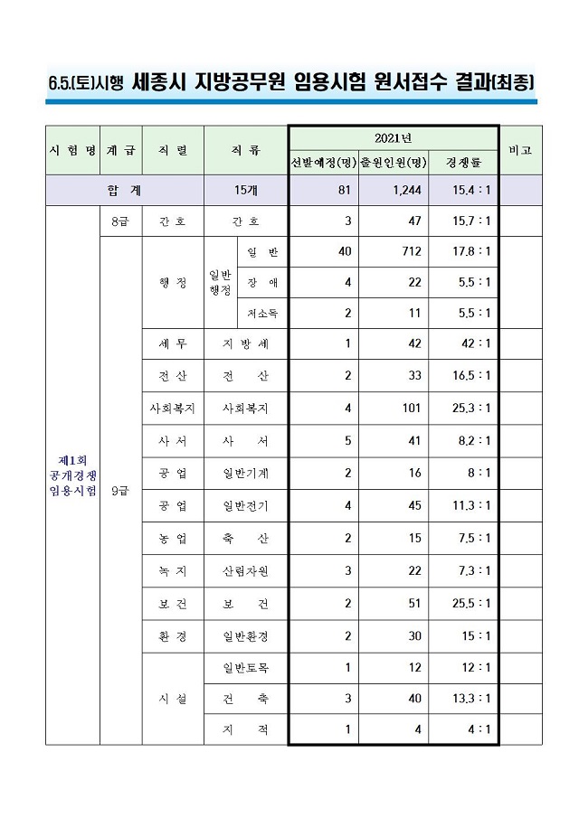 ▶ 2021년도 제1회 세종특별자치시 지방공무원 임용시험 경쟁률