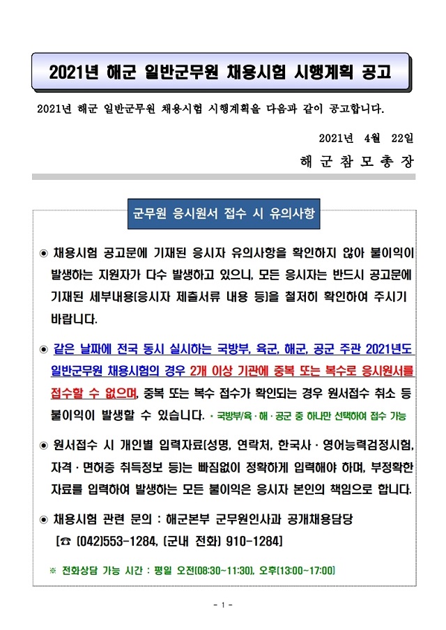 ▶ 2021년도 해군 일반군무원 채용시험 계획 공고