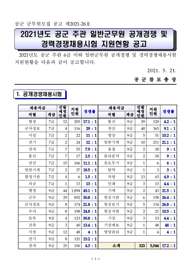 2021년도 공군 주관 일반군무원 공개경쟁 및 경력경쟁채용시험 지원현황(경쟁률) 공고.pdf