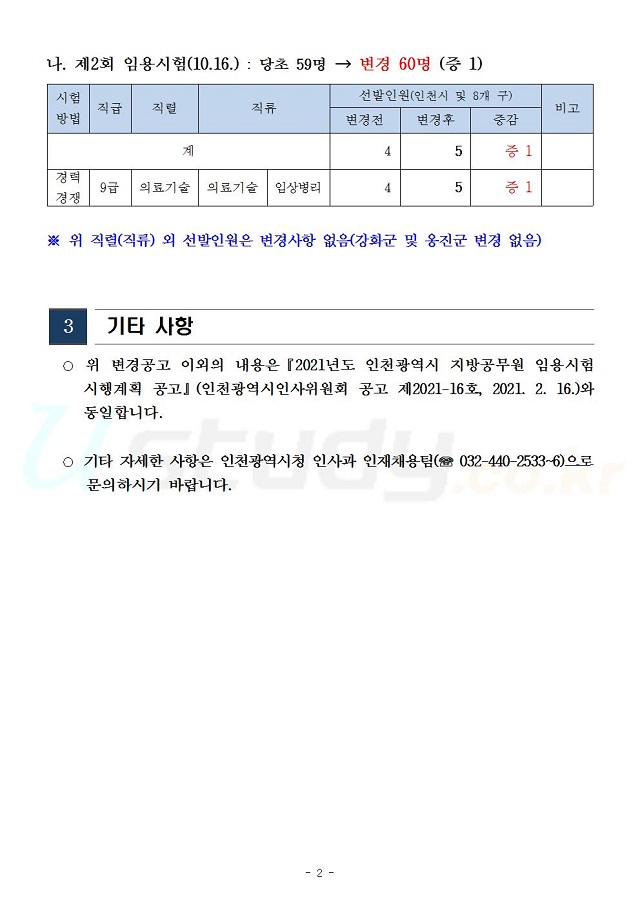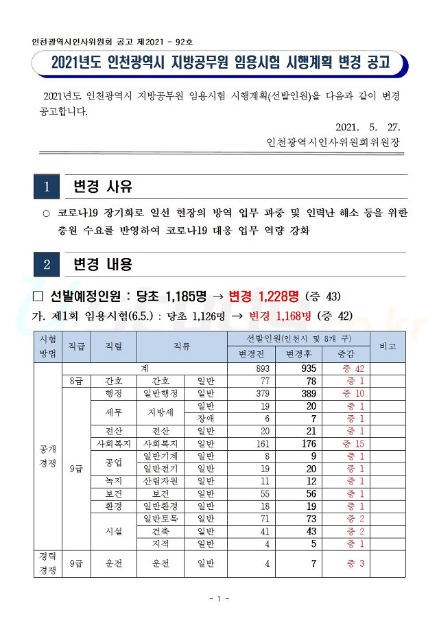 (변경 공고문)2021년도 인천광역시 지방공무원 임용시험 시행계획 변경 공고(선발인원).hwp