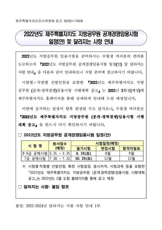 (인사위 공고 제749호) 2022년도 제주특별자치도 지방공무원 공개경쟁임용시험 일정(안) 및 달라지는 사항 안내.pdf