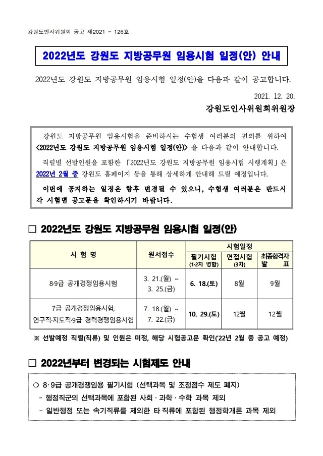 ▶ 2022년도 강원도 지방공무원 임용시험 일정(안) 안내
