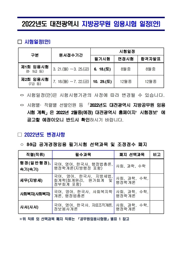 ▶ 2022년도 대전광역시 지방공무원 임용시험 일정(안) 안내