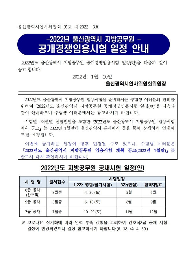 ▶ 2022년도 울산광역시 지방공무원 임용시험 일정 안내