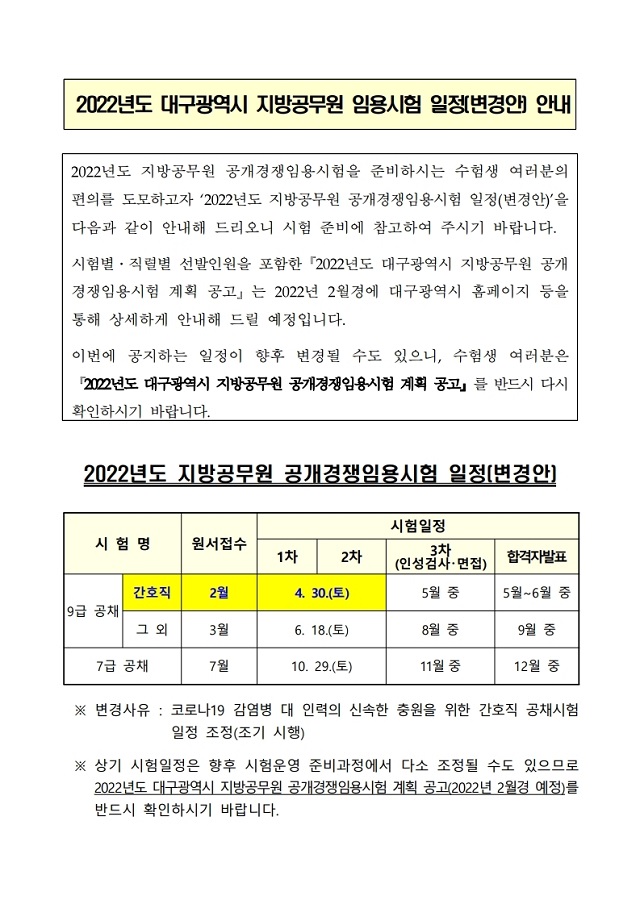 ▶ 2022년도 대구광역시 지방공무원 임용시험 일정(안) 변경 안내