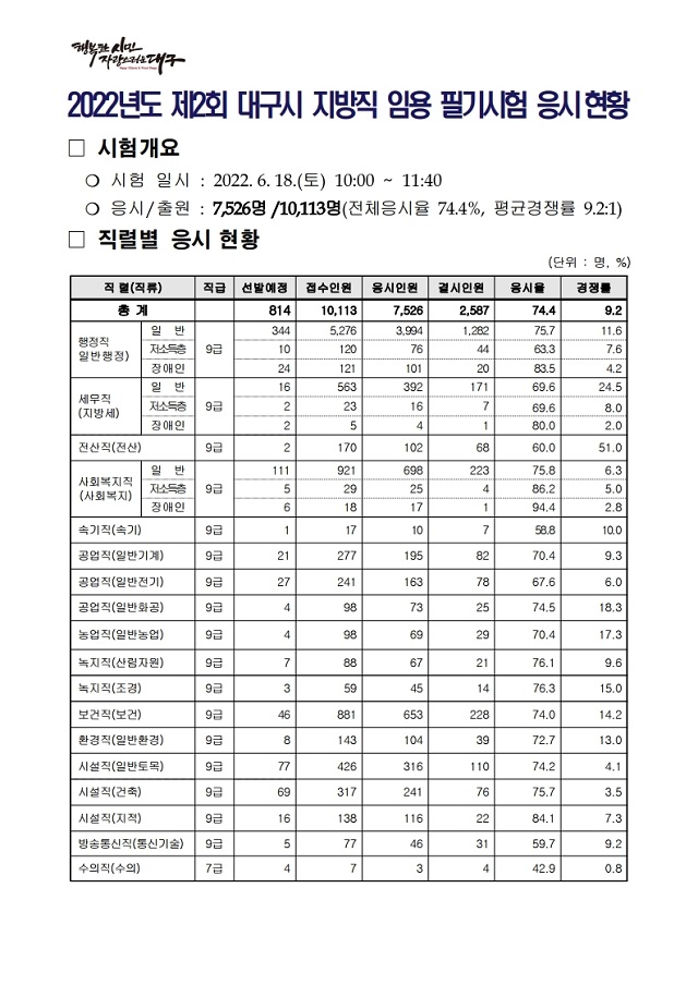 ▶ 2022년도 제2회 대구광역시 지방공무원 임용시험 경쟁률