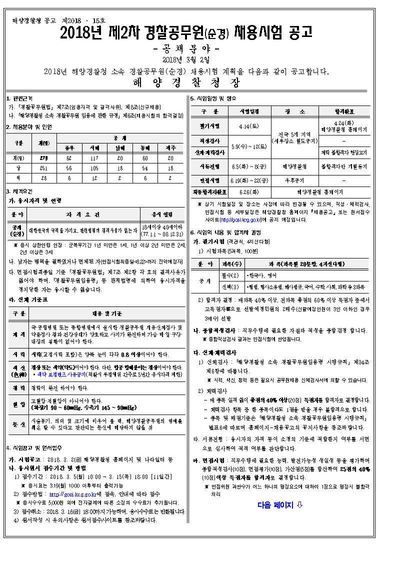 [해양경찰청] ※ 2018년 제2차 해양경찰청 경찰공무원 (순경-공채분야) 채용시험 공고(~3/15) ※조회수 : 670